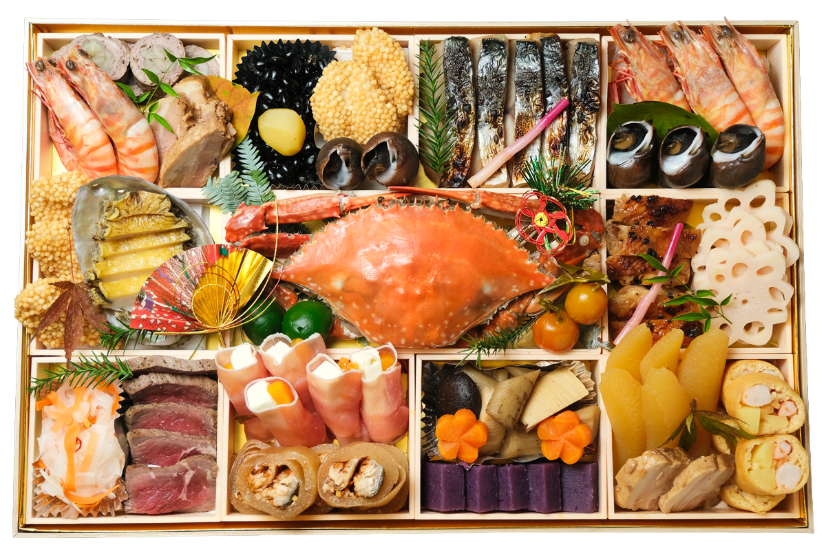 宇部産渡り蟹 / 宇部産鰆利久焼 / 謹製ローストビーフ / 福岡県産黒ばい貝旨煮 / 長州鶏袖香焼 / 牛八幡巻 / 数の子漬 / 干柿とクリームチーズ生ハム巻 / 本鮑柔煮 / 煮〆 / 有頭海老旨煮 / ふく霰揚 / 紫芋羊羹 / 鰻砧巻 / 紅白膾 / 海老春巻揚 / 黒豆 / 豚ロース生姜煮 / 金柑蜜煮 / 酢蓮